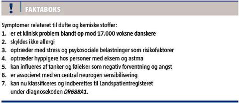 Eksponering for almindeligt forekommende dufte og andre luftbårne kemiske stoffer som parfumerede produkter, friske tryksager, nye møbler og tobaksrøg giver hos nogle mennesker anledning til en række symptomer, hvis årsager og forløb endnu i det væsentligste er ukendte. Der findes sjældent objektive tegn på overfølsomhed, inflammation eller vævsbeskadigelse med relevans for problemstillingen, og symptomerne vil kun hos et mindretal kunne tilskrives kendte sygdomme, som f.eks. astma. Problemstillingen er kompleks, fordi der efter symptomernes opståen kan forekomme en gradvis øgning i antallet af symptomudløsende dufte og kemiske stoffer med stigende påvirkning af daglig livsførelse til følge [1]. Samtidig er symptombilledet uspecifikt, da samme eksponering synes at udløse forskellige symptomer hos forskellige personer [2]. Hvorvidt symptomer, der er relateret til dufte og kemiske stoffer, kan karakteriseres som en selvstændig klinisk enhed, er endnu uafklaret [3], men symptomerne er velkendte inden for en række medicinske specialer såsom almen medicin, medicinsk allergologi, otorhinolaryngologi, arbejds- og miljømedicin og dermatologi [4]. I Tabel 1 ses en oversigt over hyppige, selvrapporterede symptomfremkaldende eksponeringer [5]. Oversigten er ikke komplet, og der findes andre eksempler på eksponeringer, som kan give anledning til symptomer.
