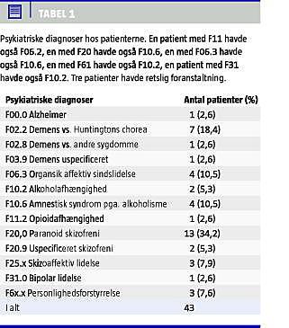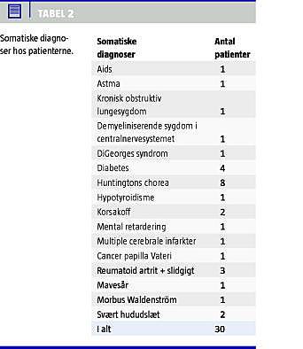 40% af patienterne havde skizofreni. Resten havde skizoaffektive lidelser, svær bipolar lidelse og personlighedsforstyrrelser. En del af patienterne havde herudover misbrugsdiagnoser, helt overvejende alkoholafhængighed eller opioidafhængighed. Som det fremgår af Tabel 2 , var forekomsten af alvorlige somatiske sygdomme høj. Disse sygdomme var kendte forud for undersøgelsen, men i flere tilfælde suboptimalt behandlet pga. pågældende patients psykose. F.eks. ønskede en skizofren kvinde ikke sin dia betes og sit myksødem behandlet. Under indlæggelse på psykiatrisk hospital lykkedes det at få disse sygdomme behandlet adækvat med anvendelse af tvang, men kort tid efter udskrivningen blev de på ny dysregulerede, da hun atter modsatte sig behandlingen. Dette mønster har gentaget sig ved hendes mange indlæggelser. Alle patienterne blev før denne undersøgelse tilset af egen læge ved somatiske problemstillinger.