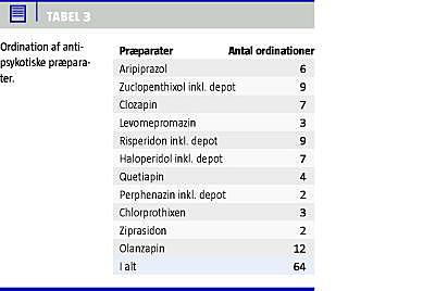 Den faste medicinering med psykofarmaka blev gjort op, idet der relativt sjældent blev benyttet pro necessitate-medicinering (hos under 10% af patienterne). Fem patienter, hvilket svarede til 13%, var ikke i behandling med et antipsykotisk medikament. 47% var i behandling med et præparat, 32% var i behandling med to præparater, og 8% var i behandling med tre forskellige antipsykotika. Ingen patienter fik fire eller flere præparater på en gang. De fleste patienter fik nye atypiske antipsykotika, men otte patienter fik udelukkende førstegenerationsstoffer, og 11 patienter fik begge typer stoffer. De benyttede præparater er vist i Tabel 3 .