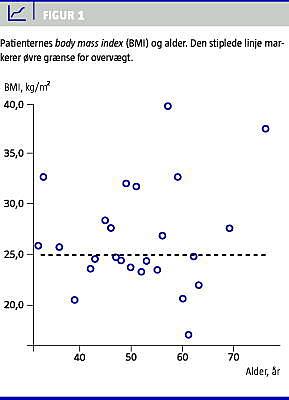 Patienternes gennemsnitlige body mass index var 26 kg/m2 , men dette dækker over betydelig variation, som vist i Figur 1 , idet ca. halvdelen af patienterne var overvægtige og en fjerdedel led af fedme. For-højet blodtryk (mere end 100 mmHg diastolisk og/eller 145 systolisk) fandtes hos 11 patienter. Disse blev henvist til undersøgelse hos deres praktiserende læge.
