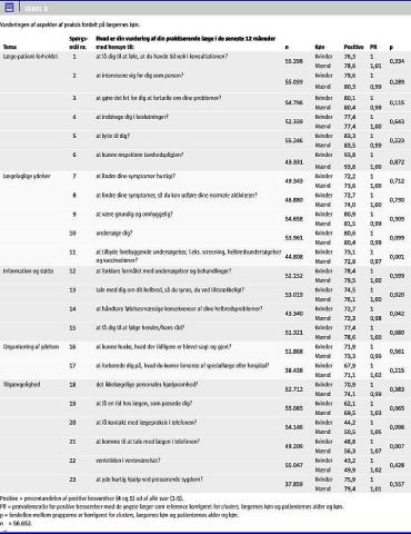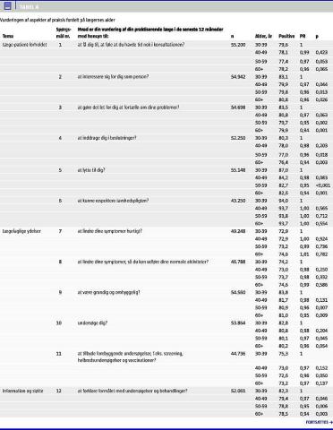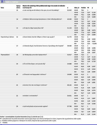 Resultater: I alt 703 læger gennemførte studiet. I analyserne indgik besvarelser fra 56.652 patienter (svarprocent 73,1). Vi fandt, at mandlige læger oplevedes at være en smule mere tilgængelige end de kvindelige. På enkelte spørgsmål vurderedes yngre praktiserende læger mere positivt end de ældre læger. Forskellene mellem aldersgrupperne var dog små.