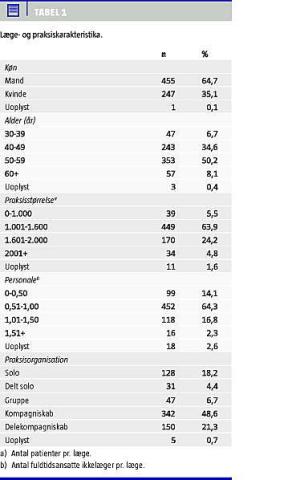 I alt 703 læger (16-66% af alle praktiserende læger i de deltagende amter/sygehuskommuner) tilmeldte sig og gennemførte studiet. Der blev returneret i alt 62.980 spørgeskemaer (svarprocent 75,2). Heraf indeholdt 56.652 besvarelser en vurdering af en af de deltagende læger med besvarelse af mere end halvdelen af spørgsmålene (endelig svarprocent 73,1). Fordelingen af de registrerede karakteristika hos læger og praksis fremgår af Tabel 2 .