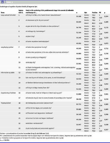 Kun besvarelser fra patienter, der havde besvaret mere end halvdelen (> 11) af de 23 spørgsmål blev inkluderet. Ved analyse af resultaterne inddelte vi lægerne i fire alderskategorier. Besvarelserne af de enkelte spørgsmål blev dikotomiseret som positive (svarkategori fire og fem) eller ikkepositive (svarkategori et, to og tre). For hvert spørgsmål beregnedes prævalensen af positive besvarelser fordelt på køn og alderskategorier. Vi sammenlignede prævalenserne i en multivariat regression med korrektion for patientens køn og alder, for praksistype og antallet af tilmeldte patienter og ansat personale i praksis samt for clusters (på lægeniveau). Analyserne vedrørende lægernes køn var desuden korrigeret for lægernes alder og omvendt. Hvor analyserne ikke konvergerede i den multivariate regressionsmodel, anvendtes i stedet Poisson-regression.