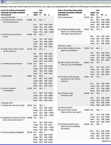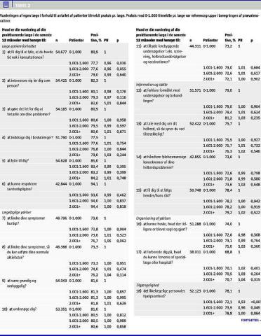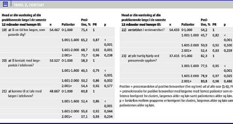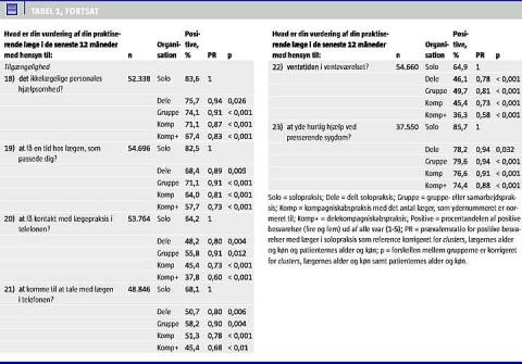 Resultater: I alt 703 læger gennemførte studiet. I analyserne indgik besvarelser fra 56.652 patienter (svarprocent: 73,1). Læger i solopraksis, læger med få patienter og læger med meget praksispersonale blev generelt mest positivt evalueret sammenlignet med læger i andre praksistyper, læger med mange tilmeldte og læger med et lille ILP.
