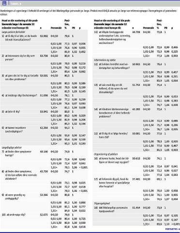 Generelt blev praksis med mere end 1,5 ILP pr. læge evalueret højere end praksis med op til 0,5 ILP pr. læge (Tabel 3 ). Lige på nær det at huske, hvad der er blevet sagt og gjort tidligere. Tilgængeligheden (spørgsmål 18-23) oplevedes bedst i praksis med mere end 1,5 fuldtids-ILP pr. læge fulgt af praksis med færre end 0,5 ILP pr. læge. Den ringeste patientoplevede tilgængelighed fandtes i praksis med 0,5-1,5 fuldtids-ILP pr. læge.
