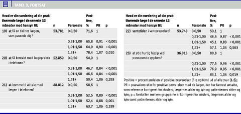 Kun besvarelser fra patienter, der havde besvaret mere end halvdelen (> 11) af de 23 spørgsmål blev inkluderet. Besvarelserne af de enkelte spørgsmål blev dikotomiseret som positive (svarkategori fire og fem) eller ikke positive (svarkategori et, to og tre). Praksistype blev inddelt i solopraksis, delt solopraksis, gruppe- eller samarbejdspraksis, kompagniskabspraksis med det antal læger, som ydernummeret var normeret til, og delekompagniskabspraksis, hvor der var flere læger end normeret. Praksisstørrelse blev opgjort som antal personer, der var tilmeldt praksis pr. læge, og antal ILP blev beregnet som fuldtidsansat ILP pr. læge i praksis. For hvert spørgsmål beregnede vi prævalensen af positive besvarelser i forhold til disse praksiskarakteristika. Vi sammenlignede prævalenserne i en generaliseret lineær regressionsmodel (GLM) med korrektion for patienternes køn og alder, lægernes køn og alder og for clusters af patienter på lægeniveau. Vi beregnede prævalensratioen (PR), hvor henholdsvis solopraksis, praksis med 0-1.000 tilmeldte og praksis med 0-0,5 ILP var referencer.