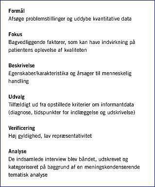 Undersøgelsen er baseret på etnografiske og sociologiske forskningsmetoder, særligt kvalitative dybdegående interview. Via en hermeneutisk tilgang blev den betydning, som den enkelte patient ud fra egen forståelse, normer og værdier har tilskrevet fænomener og oplevelser under indlæggelsen, analyseret [3-5]. Den kvalitative metode er således valgt med henblik på at få uddybende refleksioner og forklaringer på de kvantitative data fra Den Landsdækkende Patienttilfredshedsundersøgelse og ikke ud fra et ønske om generaliserbarhed. Undersøgelsens tema og fokus blev ansporet af de kvantitative fund, og der var som udgangspunkt ingen overordnet teoretisk referenceramme for undersøgelsen. Teoretisk inspiration, eksempelvis hentet fra Pierre Bourdieus analysemodel, er siden blevet inddraget med henblik på at belyse resultaterne fra analyseprocessen.
