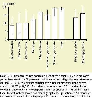Resultater: Patienternes mediane score var 18 point og uden kønsforskel. Scoren var signifikant relateret til uddannelsesniveau ( ρ = 0,39; p < 0,001) og omvendt relateret til alder ( ρ = -0,34; p < 0,001). Hos patienter (og blandt de personer, der modtog spørgeskemaet via internet) vidste f.eks. hhv. 84% (90%) og 85% (80%), at osteoporose er en medvirkende årsag til de fleste tilfælde af hoftefrakturer og vertebrale frakturer hos ældre, mens kun 69% (38%) vidste, at D-vitamin er vigtigt for knoglerne, og 67% (66%), at rygning øger risikoen for osteoporose. Ved test-retest var kappa 0,78 ± 0,03.
