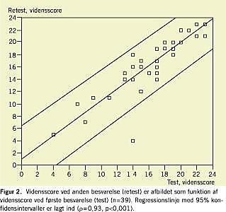 Vi udformede, validerede og testede et spørgeskema til måling af viden om osteoporose. Spørgeskemaet havde god kognitiv validitet og umiddelbar gyldighed samt reproducerbarhed på linje med lignende instrumenter [15]. Test-retest gav en kappaværdi på 0,78, hvilket viser god overensstemmelse mellem svarene. Endelig var det dynamiske område for skemaet vurderet ved resultaterne for gruppe 1 acceptabelt.