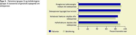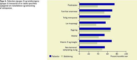 Selv om spørgsmålene blev administreret på forskellig vis til patienter og befolkningen, svarede patienterne hyppigere korrekt end befolkningen. Vores undersøgelse giver ikke mulighed for at udtale sig om grunden til dette. Det kan f.eks. skyldes, at patienterne havde søgt læge på grund af viden om risikofaktorer for osteoporose. Det kan imidlertid også skyldes, at patienterne erhvervede viden om osteoporose i forbindelse med konsultationen hos den praktiserende læge.