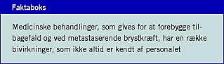 Taksigelser: Artiklen inddrager resultater af danske undersøgelser, der er gennemført takket være mange patienters besvarelse af spørgeskemaer, har bygget på et nært samarbejde med Danish Breast Cancer Cooperative Group og et stort antal danske kirurgiske, onkologiske og medicinske afdelinger.