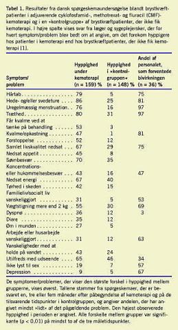 Tabel 1 viser udvalgte resultater fra undersøgelsen. De hyppigste følger af kemoterapi var hårtab, hede- og svedeture, uregelmæssig eller ophørt menstruation, træthed og kvalme. De vasomotoriske symptomer, vaginal tørhed og den uregelmæssige menstruation skyldes, at kemoterapien bringer en stor del af de præmenopausale patienter i menopause. Sandsynligheden for at blive bragt i menopause er stærkt relateret til alder. Således er den omkring 25-40% hos kvinder under 40-års-alderen, mens den stiger til ca. 70% hos kvinder, der er over 40 år på diagnosetidspunktet [3, 4]. Andre akutte bivirkninger er forstoppelse, diare og slimhindepåvirkning, der blandt andet viser sig som stomatitis. Disse symptomer påvirker familielivet og det sociale liv, ligesom mange patienter er sygemeldt fra deres arbejde.