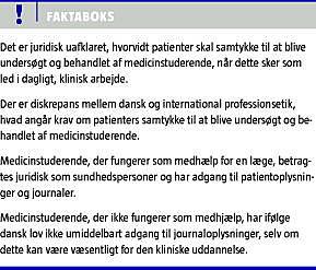 Ifølge Lægeforeningens etiske retningslinjer skal der - i modsætning til WHO's og WMA's retningslinjer [6, 7] - heller ikke i denne situation indhentes samtykke til, at den studerende indgår i det kliniske arbejde [5]. Lovgivningen omtaler ikke denne situation, men på grund af sundhedslovens regler om videregivelse af oplysninger skal patienten normalt informeres om, at den studerende medvirker til eller observerer behandlingen. Lægens tavshedspligt gælder også over for de studerende, og det vil ikke umiddelbart være lovligt at lade studerende læse journalen eller informere om patientens tilstand uden patientens skriftlige informerede samtykke [2, lovens §§ 44-45]. Lovgivningen tager således ikke eksplicit hensyn til behovet for at videregive oplysninger i forbindelse med den kliniske uddannelse.