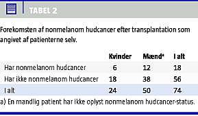Otte ud af 74 patienter oplyste at have NMHC før transplantationen. En patient havde ikke besvaret spørgsmålet. Tre ud af 75 patienter angav at have fået huden undersøgt før transplantationen i relation til transplantationsforløbet.