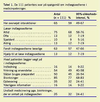 Resultater: I alt 111 patienter blev inkluderet. Otteogfirs patienter (79%) læste altid eller ofte indlægssedlerne. Heraf lagde 77% vægt på bivirkninger, mens kun knap 13% lagde vægt på al information i indlægssedlen. Der var 21%, som aldrig eller sjældent læste indlægssedlerne, men stolede på lægen eller apotekeren. Af de interviewede havde 62% ikke problemer med at læse og forstå indlægssedlerne. Blandt de øvrige havde 57% vanskeligheder pga. skriftstørrelsen, og 33% fandt skriftsproget vanskeligt. I alt 35 patienter (32%) angav, at de havde stoppet medicinering pga. information om bivirkninger på indlægssedlen.