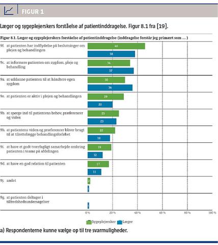 Undersøgelser af sundhedsprofessionelles forståelser af patientinddragelse og oplevelser af praksis viser, at der hersker mange forskellige forståelser af begrebet. Den primære forståelse af patientinddragelse ligger inden for rammerne af informeret samtykke og egenomsorg, hvor patientens resurser – i højere grad end viden – anvendes [19, 20] (Figur 1). En spørgeskemaundersøgelse fra 2014 viser, at læger og sygeplejersker meget gerne vil inddrage patienterne og finder det vigtigt. I praksis sker inddragelsen primært ved, at patienternes resurser til egenomsorg udnyttes, og i mindre grad ved at patientens viden inddrages. Hver femte sygeplejerske og knap hver fjerde læge svarer, at de i mindre grad eller slet ikke inddrager patientens viden, mens 28% af sygeplejerskerne og 23% af lægerne i undersøgelsen svarer i høj grad [19]. Sundhedsprofessionelle oplever, at mangel på personaleresurser og tid, mangel på viden om metoder, utilstrækkelige fysiske rammer og for syge patienter er barrierer for inddragelse.