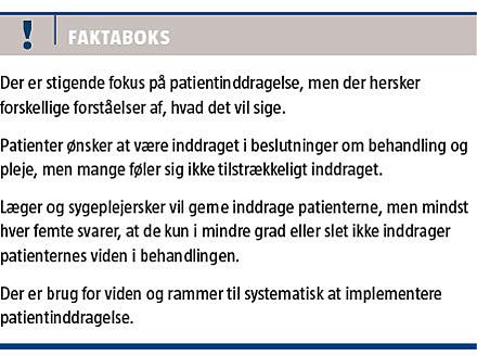 I Danmark er sygdomsbilledet under forandring, og et større antal personer skal lære at leve med en eller flere sygdomme eller alvorlige følgevirkninger af sygdom og behandling hele livet [1]. Det kræver et sundhedsvæsen, der i højere grad end tidligere målretter sine indsatser til at understøtte den enkelte i at håndtere et liv med sygdom og i den forbindelse inddrager patienternes viden, præferencer og behov i beslutninger. Patientinddragelse står blandt andet derfor højere på sundhedsvæsenets dagsorden end nogensinde før. Sundhedsprofessionelle ønsker at inddrage, patienter vil gerne inddrages, og der er stigende politisk opbakning til mere patientinddragelse i sundhedsvæsenet. Det er derfor relevant at gøre status over, hvor langt vi er med inddragelse, og hvor langt vi har igen for at opnå et sundhedsvæsen, hvor patienter systematisk bliver inddraget. Det kræver en tydeliggørelse af, hvilke barrierer der er for inddragelse, og konkrete bud på hvordan disse kan håndteres. Artiklen er afgrænset til at omhandle inddragelse af patienter i egen behandling og forløb og ikke organisatorisk inddragelse og inddragelse af pårørende.