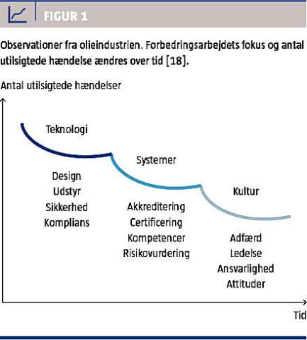 Efter knap ti år med lovbundet patientsikkerhedsarbejde i det danske sygehusvæsen er der fortsat usikkerhed om, hvilke metoder der er mest effektive til kontrol af risiko og reduktion af antallet af patientskader. Erfaringer fra olieindustrien viser, at arbejdet med at nedbringe antallet af UTH har bevæget sig fra forbedring af teknologi og standarder via implementering af ledelsesstrategier til udvikling af sikkerhedskulturen (Figur 1). Samtidig har man i nyere internationale studier fra sundhedsvæsenet dokumenteret en sammenhæng mellem forbedring af PSK og samtidig reduktion af patientsikkerhedsproblemer som fald, infektioner og mortalitet [10-18].