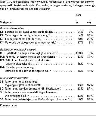 Der blev brugt individuelle, strukturerede interview med anvendelse af interviewguide (Tabel 1 ). Spørgsmålene, der var formuleret ud fra en pragmatisk vurdering af kerneelementer i de tre roller, var udarbejdet af forfatteren, der også gennemførte alle interviewene. Guiden indeholdt tolv spørgsmål, fire for hver kompetence. Svarmulighederne var: ja/nej. Spørgsmålenes fokus var den senest oplevede stuegang. Alle patienterne blev interviewet på deres stue 1-2 timer efter formiddagsstuegang. Sidst i interviewet havde patienterne mulighed for at kommentere alle de oplevede stuegange på afdelingen. Det maksimale antal kommentarer var fire. Følgende data blev registreret: køn, alder og patientens angivelse af: 1) årsag til indlæggelse, 2) indlæggelsesvarighed og 3) hvilken kategori lægen, der havde gået den senest udførte stuegang, tilhørte. Alle data var patientrapporterede. Årsagen til indlæggelsen blev af undersøgeren opdelt i livstruende og ikkelivstruende lidelser.