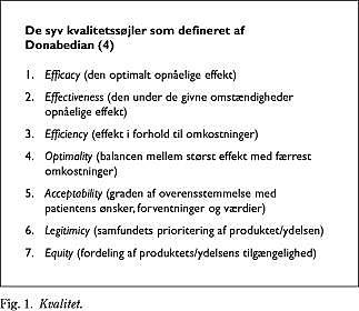 Kvalitet defineres som de samlede egenskaber ved et produkt eller en ydelse, som gør det/den i stand til at opfylde brugerens behov (1). For at gøre kvalitet målbar, må begrebet beskrives vha. målbare delaspekter. Identifikation og belysning af delaspekter af kvalitetsbegrebet (2-4) (Fig. 1 ) betyder, at processer til afklaring af kvalitetsproblemer og mulige løsninger bliver enklere, ligesom de forskellige interessenters perspektiver - typisk det sundhedsfaglige, det politiske/sundhedsøkonomiske og brugernes - tydeliggøres (5).