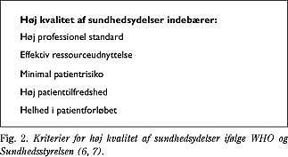 På samme måde som patientcentreret arbejdsmåde i konsultationen sætter lægen i stand til i sin behandling at tage udgangspunkt i sygdommens betydning for patienten (13), betyder anlæggelsen af patientens perspektiv i kvalitetsudviklingsarbejdet, at tilrettelæggelsen af sundhedsydelser og fastsæt-telse af de dertil svarende kvalitetsmål i højere grad lever op til den definition på god kvalitet, som WHO har formu-leret, og som inkluderer høj patienttilfredshed (11) (Fig. 2).