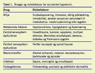 Risikofaktorer for udløsning af AH er tilstande med påvirket central termoregulation, autonom dysfunktion og nedsat evne til varmeproduktion eller mangel på isolering (Tabel 1 ). Børn og ældre [1] er særligt disponerede for AH. Alkoholintoksikation er den hyppigst forekommende risikofaktor [2].