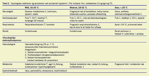 Legemets kompensation for varmetab er tosidig: Yderligere varmetab søges begrænset, og varme genereres. De kompensatoriske mekanismer initieres af hudreceptorer, hvis afferente signaler går til en refleksbue, der medierer perifer vasokonstriktion, samt til hypothalamus. Her medieres et hurtigt respons via det autonome nervesystem (især sympatikus), et langsommere endokrint respons og et respons, der sikrer en adækvat psykisk reaktion - vi fryser, tager tøj på og går indenfor. Hypothalamus integrerer også blodtemperaturen [4]. Ved dybere grader af hypotermi med temperatur under 32 °C aftager de kompensatoriske mekanismer og kropsfunktioner, samtidig med at metabolismen aftager. Svært hypoterme patienter, som har en kernetemperaturer under 30 °C, vil oftest være bevidstløse og tiltagende svære at skelne fra døde. Den laveste kernetemperatur, som et menneske har overlevet, er 13,7 °C [5]. Der er betydelig variation i organernes reaktion på afkøling såvel mellem enkelte individer, alt efter hvordan, hvor lang, hvor kraftig og hvor hurtigt kuldepåvirkningen er sat ind (Tabel 2 ) [4, 6].