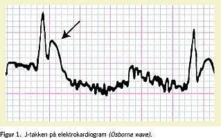 På elektrokardiogrammet (EKG) ses der ofte en J-tak ved ca. 33 °C. J-takken er et positiv udslag ved overgangen mellem QRS-komplekset og ST-stykket (Figur 1 ) og ses i inferiore afledninger II, III og aVF og i de prækordiale afledninger V5 og V6. Med faldende temperatur øges amplituden af J-takken, som udbredes til alle afledninger. J-takken er karakteristisk, men ikke patognomisk for hypotermi, idet den også kan ses ved cerebrale skader og myokardieiskæmi. Andre nonpatognomiske EKG-forandringer, f.eks. grenblok, forlænget QT-interval og ST-depression/elevation kan forveksles med myokardieiskæmi. Årsagen til EKG-forandringerne er ikke klarlagt [10, 11]. Betydningen af J-takken er begrænset, men det understøtter, at myokardiets konduktion og impulsudbredelse er ændret. Det kolde myokardiums arytmitendens er også søgt forklaret ved re-entry -fænomener [12] på baggrund af dispersion of refractoriness -modellen, hvor der i myokardiet findes områder med forskelle i temperatur og forskelle i refraktærperioder. Dertil kommer, at myokardiet udviser irritabilitet ved temperatur under 27 °C, hvorved manipulation, f.eks. flytning fra båre til leje, kan inducere ventrikelflimren. EKG-forandringer, arytmier og irritabilitet er generelt behandlingsresistente [10], men forsvinder ved opvarmning.