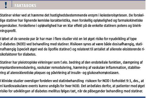 Resultaterne af flere studier, hvor man har undersøgt effekten af statiner versus placebo, tyder på, at statiner som klasse øger patienternes risiko for at få DM. Dog tyder subanalyser på, at der er potent forskel på de enkelte statiner. Der ses en tendens til, at pravastatin kan reducere risikoen for udviklingen af NOD. Dette er fundet både i in vitro-forsøg og i tre kliniske studier, hvor man fandt en reduceret risiko [18, 28]. I et studie blev der påvist en signifikant øget tendens til udviklingen af NOD (PROSPER) [28], hvilket kan skyldes forskelle i populationsgruppen og i deres endemål. Således blev der f.eks. ikke målt