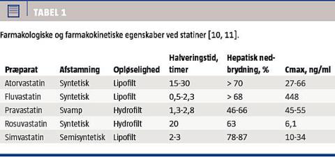 Der er i øjeblikket fem statiner på markedet i Danmark: simvastatin, pravastatin, fluvastatin, atorvastatin og rosuvastatin. De har alle kemiske karakteristika, der ligner hinanden, men har forskellig opløselighed og farmakokinetiske egenskaber (Tabel 1). Forskellene i opløselighed har en klar effekt på de enkelte statiners potens og bivirkningsprofil [10, 11]. For lipofile statiner er den primære mekanisme en diffusion igennem hepatocytcellemembranen. For de hydrofile statiner sker den primære optagelse via tranportproteiner i cellemembranen [9].