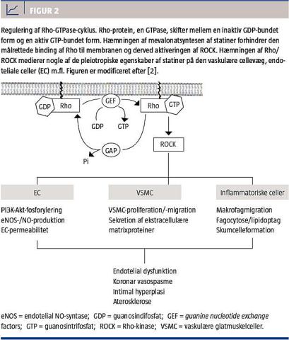 Rho-protein, en guanosintrifosfat (GTP)ase, skifter mellem en inaktiv guanosindifosfat (GDP)-bundet form og en aktiv GTP-bundet form. Hæmning af statiners mevalonatsyntese forhindrer den målrettede binding af Rho til membranen og derved aktiveringen af Rho-kinase (ROCK) (Figur 2). Hæmningen af Rho/ROCK medierer nogle af statiners pleiotropiske egenskaber på den vaskulære cellevæg (Tabel 2) [2, 12].