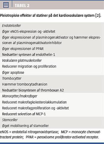Statiner er de mest anvendte lægemidler i verden [1]. I kliniske forsøg er statiner påvist at have en gavnlig effekt på såvel primær som sekundær profylakse af hjerte-kar-sygdomme [2]. 3-hydroxy-methylglutaryl-koenzym A (HMG-CoA)-reduktasehæmmere (statiner) er potente hæmmere af kolesterolbiosyntesen. Den gavnlige effekt af statiner kan ikke udelukkende forklares ud fra de lipidsænkende egenskaber [2]. Resultaterne af nogle studier tyder på, at statiner har pleiotropiske (uafhængig af kolesterolniveauet) virkninger [2], heriblandt bedring af endotelcellefunktionen, effekt på myokardieremodulering, vaskulær remodulering, hæmning af vaskulær inflammation, stabilisering af aterosklerotiske plaques samt påvirkning af insulin- og glukosehomøostasen [2-9].