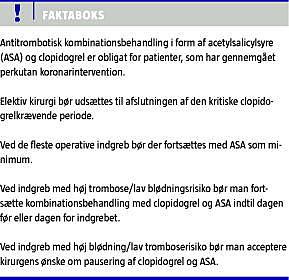Antallet af patienter, som i dag behandles med ASA og/eller clopidogrel, er stigende dels som følge af profylaktisk behandling for iskæmisk hjertesygdom, dels grundet en øget frekvens af PCI i form af ballondilatation og/eller stentimplantation [2]. Internationale studier har vist, at risikoen for koronar trombose ved for tidlig pausering af antitrombotisk behandling efter PCI er større end risikoen for betydende per- og postoperative blødningskomplikationer ved elektiv nonkardiel kirurgi [3]. Tilsvarende er konsekvensen af tromboemboliske komplikationer ofte langt alvorligere end følger efter blødningskomplikationer [2]. Denne problemstilling er yderst relevant for kirurger og anæstesiologer, eftersom præoperativ fejlinformation af patienten og manglende viden om antitrombotisk behandling vil kunne medføre en betydelig øget perioperativ morbiditet og mortalitet [1].