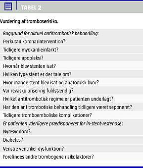 Inden en korrekt perioperativ behandlingsstrategi iværksættes for patienten i ASA- og/eller clopidogrelbehandling, er det vigtigt at foretage en individuel risikovurdering (Tabel 2 ). Denne risikovurdering bør ideelt varetages af et lægeteam, der består af en kirurg, en anæstesiolog og en kardiolog på baggrund af den bedste gældende evidens, som opvejer patientens sandsynlighed for perioperative blødningsrelaterede komplikationer med risikoen for udvikling af tromboemboliske komplikationer [10]. Endvidere giver et tværfagligt forum mulighed for at vurdere vigtigheden af det aktuelle kirurgiske indgreb, alternativer til kirurgi, tidsperspektivet for kirurgisk intervention (akut/subakut/elektivt), anæstesiologisk teknik, perioperativ kardiel morbiditet- og mortalitetsrisiko, mulig komplementærbehandling samt, om et eventuel kirurgisk indgreb bør foregå på et hospital med mulighed for 24-timers PCI.