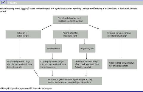 Der skelnes imellem patienter, som har fået isat BMS og DES. ASA pauseres på intet tidspunkt ved begge stenttyper, medmindre der forventes blødning i »lukkede rum" (f.eks. intrakraniel kirurgi), eller hvis der er forventelig kompression eller forskydning af vitale strukturer på baggrund af øget blødningstendens. Heparin kan ikke erstatte hverken ASA eller clopidogrel perioperativt [7].