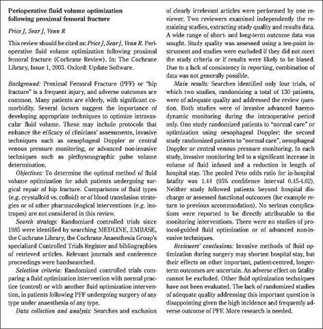 <li>Price J, Sear J, Venn R. Perioperative fluid volume optimization following proximal femoral fracture (Cochrane review). I: The Cochrane Library, Issue 2, 2002. Oxford: Update Software.</li>