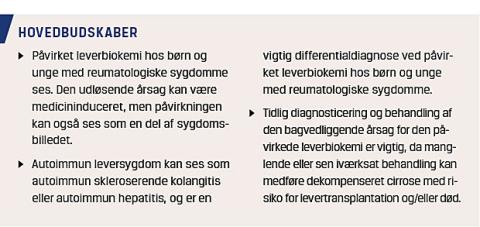 Reumatologiske sygdomme hos børn er sjældne og omfatter en bred vifte af sygdomme, hvoraf den hyppigste er juvenil idiopatisk artritis (JIA), med en prævalens på 44,7 pr 100.000 [1]. Andre sygdomme er de autoinflammatoriske lidelser såsom genetiske febersyndromer og kronisk recidiverende osteomyelitis, komplekse bindevævssygdomme såsom systemisk lupus erythematosus (SLE), juvenil dermatomyositis (JDM) og mixed connective tissue diseaser, sklerodermi samt vaskulitissygdomme [1-4]. Sjældnere ses andre autoimmune lidelser som immunglobulin (Ig)G4-relateret sygdom [5]. Påvirket leverbiokemi hos børn, der har disse sygdomme, kan skyldes flere faktorer: 1) reumatologiske sygdomme er immunmedierede, og leveren indgår i produktionen af cytokiner, som er vigtige signalstoffer i det immunologiske beredskab, 2) leveren producerer immunkomplekser, som har en helt central rolle i udviklingen af artritissymptomer, og 3) leveren kan være et selvstændig target i den immunologiske reaktion, som det ses ved autoimmun leversygdom [6].