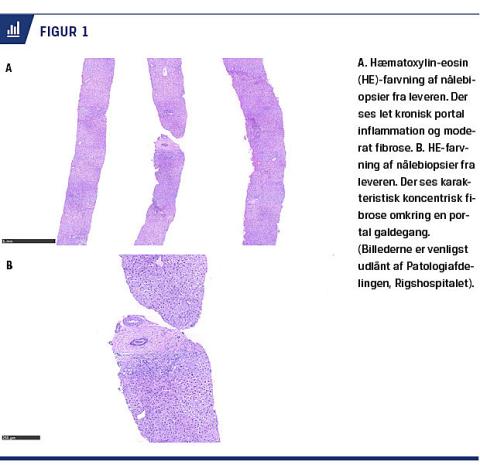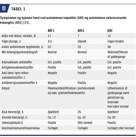 AIH er en progressiv inflammatorisk leversygdom, som er kendetegnet ved et forhøjet leverenzymniveau, forhøjet IgG-niveau og tilstedeværelse af autoantistoffer. Ud fra tilstedeværelsen af autoantistoffer kan AIH opdeles i to former. AIH1 er den hyppigste og er karakteriseret ved tilstedeværelsen af antinukleære antistoffer (ANA) og glat muskelcelle-antistoffer (GLM). AIH2 er sjældnere, men ses hyppigere hos børn end hos voksne [11, 12]. Her ses der positive levercytosolantistoffer (anti-LC-1) eller lever-nyre-mikrosomalantistoffer, GLM er som oftest negativ, men kan være til stede. Hos ca. 10% af børn og unge med AIH kan der ikke påvises specifikke autoantistoffer. Ved histologisk undersøgelse ses der ved begge former portal infiltration af lymfocytter og plasmaceller, som spreder sig ud i vævet (interfaseaktivitet). I mere fremskredne tilfælde kan der ses fibrose og cirrose (Figur 1). AIH kan have ekstrahepatologiske manifestationer, som ligner JIA’s, såsom smerter i led og sjældnere hævelse af led [11, 13]. I modsætning til hos voksne, ses der ved skleroserende kolangitis hos børn ofte autoimmune manifestationer, hvorfor nomenklaturen ASC ofte anvendes hos børn, mens tilstanden hos voksne benævnes primær skleroserende kolangitis. ASC forekommer sjældnere i forbindelse med reumatologiske sygdom end AIH. ASC er kendetegnet ved inflammation og fibrose af de intra- og/eller ekstrahepatiske galdegange, og der kan ses andre autoimmune manifestationer. Hos børn er der et stort overlap mellem AIH og ASC [14], og i et prospektivt studie med 16 års opfølgningstid fandt man, at ca. halvdelen af børnene med AIH havde magnetisk resonans-kolangiopankreatografi (MRCP)-verificerede forandringer af galdegangene, hvilket er patognomomisk for ASC [12]; hos ca. 25% af patienterne, som havde forandringer på MRCP, fandtes der ikke histologiske forandringer af galdegangene, hvorfor begge undersøgelser er nødvendige. De øvrige fund ved ASC ligner fundene ved AIH. I Tabel 1 er opdelingen imellem AIH1, AIH2 og ASC skitseret, baseret på 52 børn, som initialt var diagnosticeret med AIH [11].