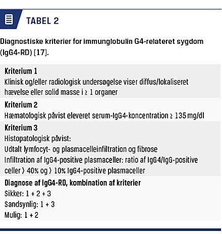 En nyligt beskrevet autoimmun sygdom, IgG4-relateret sygdom (IgG4-RD), kan også være involveret i udviklingen af leversygdom. Den ses fortrinsvist hos midaldrende patienter, men der er også rapporeret om tilfælde hos børn [5, 16]. IgG4-RD er en sjælden fibroinflammatorisk sygdom, som er karakteriseret ved infiltration i vævet af IgG4-positive plasmaceller og kan afficere alle kroppens organer, fraset hjernen [5]. De diagnostiske kriterier er skitseret i Tabel 2 [17]. Skleroserende kolangitis er tidligere beskrevet værende udløst af IgG4-RD [5], dog kan det være svært at stille diagnosen IgG4-RD, når sygdommen rammer områder, hvor det er svært at foretage bioptering, som det er tilfældet hos børn med skleroserende kolangitis.