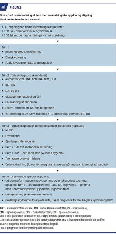 leveraffektion er en del af sygdommen, og sekundært skal der udelukkes amyloidoseudvikling. Udredningen foregår primært hos en pædiatrisk reumatolog, men ved manglende diagnose er det vigtigt, at der bliver konfereret med en pædiatrisk hepatolog og evt. også Center for sjældne sygdomme, Rigshospitalet. I Figur 2 er der skitseret en trinvis udredning af ALAT-forhøjelse, det skal dog bemærkes, at udredningen bør individualiseres efter kliniske og parakliniske fund.
