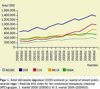 Amtets udgift pr. DDD for alle lægemidler faldt i studieperioden med 22% fra 4,08 kr. i 4. kvartal 2002 (over landsgennemsnittet) til 3,17 kr. i 3. kvartal 2004 (under landsgennemsnittet). Antallet af ordinerede DDD steg i hver af de fem lægemiddelgrupper efter iværksættelsen af interventionen (Figur 1 ). Efter interventionen steg de billige analogers andel af de ordinerede lægemidler (opgjort i DDD) i de fem lægemiddelgrupper.