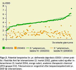 Før interventionen lå Roskilde Amts udgift pr. DDD over landsgennemsnittet. Efter interventionen faldt amtets udgift pr. DDD til under landsgennemsnittet, og studieområdet var det eneste amt i Danmark, hvor udgifterne til de lægemidler, der blev ordineret i almen praksis, faldt i studieperioden.