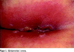 En 13-årig dreng blev henvist pga. mistanke om et perianalt herpesvirusulcus. Patienten havde i 2-3 uger haft et knoppet udslæt og forudgående en længere periode med kløe perianalt. Angiveligt havde patienten tabt sig 4 kg i de seneste tre uger. Objektivt sås der udtalt sårdannelse perianalt (Figur 1 ). Medialt på højre nateshalvdel fandtes tre plateauagtige, eleverede elementer, der målte op til 10 mm i diameter. To lignende elementer sås på henholdsvis venstre nateshalvdel og proksimalt/medialt på venstre femur. Dorsalt på penis sås et godt 10 mm stort element med nogen rødme omkring. Der observeredes ingen udtalt adenitis inguinalis. Ved lysmikroskopi på en stansebiopsi fra et element på venstre femur sås en uregelmæssig akantonisk epidermis med vakuolisering af superficielle epitelceller og i et område infarcering. I den papillære og subpapillære del af corium - stedvis nående den dybere del - fandtes en massiv inflammatorisk reaktion generelt domineret af T-lymfocytter, overvejende T-suppressorceller og histiocytære celler. Mod epitelet sås et stigende antal neutrofile granulocytter og diapedese af cellerne op i epitelet. Der sås ingen karproliferation, men udtalt papillært ødem og eksocytose af erytrocytter, hvilket også observeredes i epitelet stedvis imiterende inklusionslegemer.