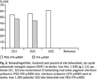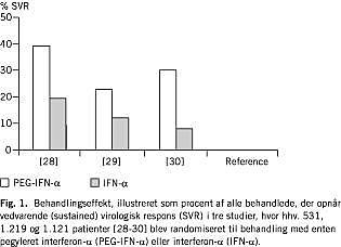 Heathcote et al [30] randomiserede 271 patienter med cirrose eller fibrose til behandling med 3 MIU IFN-α-2a × 3 ugtl. eller 90 μg eller 180 μg PEG-IFN-α-2a × 1 ugtl. Målt som SVR var effekten af 180 μg det dobbelte af 90 μg og fire gange den af IFN-α, hhv. 30%, 15% og 8% (Fig. 1).