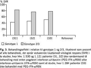 Manns et al [31] randomiserede 1.530 patienter til enten at få 1,5 μg/kg PEG-IFN-α-2b × 1 ugtl. med 800 mg RBV dagl. eller 1,5 μg/kg PEG-IFN-α-2b × 1 ugtl. i fire uger, hvorefter 0,5 μg PEG-IFN-α-2b × 1 ugtl. med 1.000-1.200 mg RBV dagl. eller 3 MIU × 3 ugtl. IFN-α-2b med 1.000-1.200 mg RBV dagl. SVR var 54% for den høje dosis PEG-IFN-α-2b og 47% for de to øvrige behandlingsregimener (Fig. 2 ). For patienter med genotype 1, der fik 1,5 μg/kg PEG-IFN-α-2b/RBV, opnåede 42% SVR. Patienter med genotype 2 eller 3 responderede med cirka 80% SVR, uanset behandlingsregimen (Fig. 3 ).