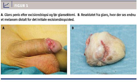 Malignt melanom (MM) lokaliseret på penis er en sjælden tilstand, som udgør 0,2% af samtlige melanomer hos mænd og har en dårlig prognose. MM på penis er oftest lokaliseret på glans (55%), i 28% af tilfældene på præputium, hos 9% på corpus penis og i 8% af tilfældene i meatus urethra [1]. MM på penis ses typisk hos mænd i alderen 50-70 år, medianalderen er 64 år [2, 3]. To- og femårsoverlevelsen beskrives at være henholdsvis 63% og 31% [3]. Da sygdommen er sjælden, er der kun beskrevet få tilfælde, hvorfor tallene er baseret på et mindre materiale.