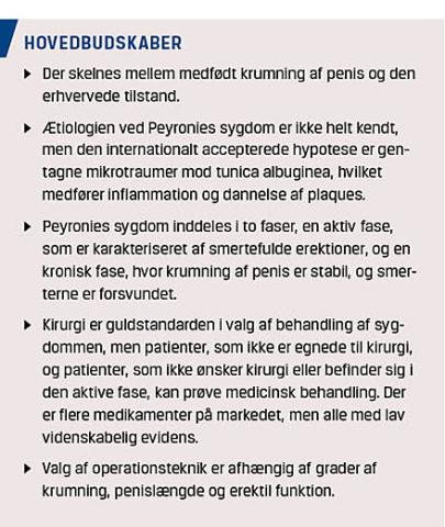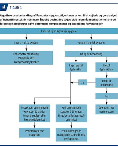 behandling af Peyronies sygdom [1]. En del medicinske behandlinger er blevet testet i den akutte fase, især i USA, men med meget beskeden effekt, og på baggrund af dette fokuseres der i denne artikel kun på den medicinske behandling, som har vist en relativ effekt.