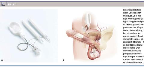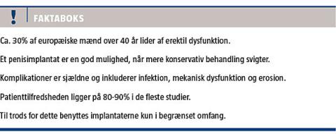 Førstevalget ved ED er peroral behandling med fosfodiesterase-5-enzym (PDE5)-hæmmere i form af sildenafil, tadalafil, vardenafil eller avanafil. Ved manglende effekt kan man forsøge intrakavernøs injektionsbehandling med alprostadil eller aviptadil/phentolamin, intrauretral behandling med alprostadil og vakuumpumper [1]. Hos nogle patienter er den erektile funktion dog så nedsat, at disse behandlinger ikke har effekt [7]. Her er et kirurgisk indsat penisimplantat en sidste mulighed. Implantaterne giver høj patienttilfredshed, men bruges – formentlig på grund af begrænset kendskab blandt læger og patienter – kun i begrænset omfang i Danmark. Således indopereres der 40-50 implantater pr. år. Formålet med denne artikel er at beskrive behandlingen samt redegøre for effekt og komplikationer.