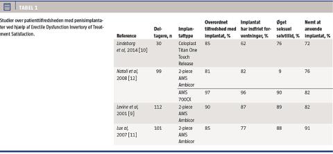 Man har i flere studier har undersøgt patienttilfredsheden med penisimplantater ved hjælp af Erectile Dysfunction Invertory of Treatment Satisfaction (EDITS) [9-12], og de er derfor nemt sammenlignelige, som det fremgår af Tabel 1. Overordnet fandt man, at 81-97% var tilfredse med implantatet, mens 62-96% angav, at implantatet havde indfriet deres forventninger. I tillæg til studierne i Tabel 1 har man i et amerikansk studie brugt EDITS til at undersøge tilfredsheden hos 96 patienter hhv. tre, seks og 12 måneder postoperativt. Her steg tilfredsheden hos patienterne for hvert interval [13].
