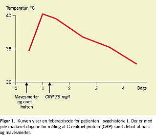 I. En syv år gammel dreng blev henvist til ambulant udredning pga. recidiverende feber. Gennem tre år havde han haft recidiverende feberperioder (> 39,5 °C) efterfulgt af 3-4 ugers symptomfrie intervaller. Feberen varede 3-5 dage, hvor han var alment medtaget samt generet af hals- og mavesmerter (Figur 1). Symptomerne førte til et betydeligt skolefravær og hyppige indlæggelser, hvor han imidlertid aldrig fik påvist infektioner.